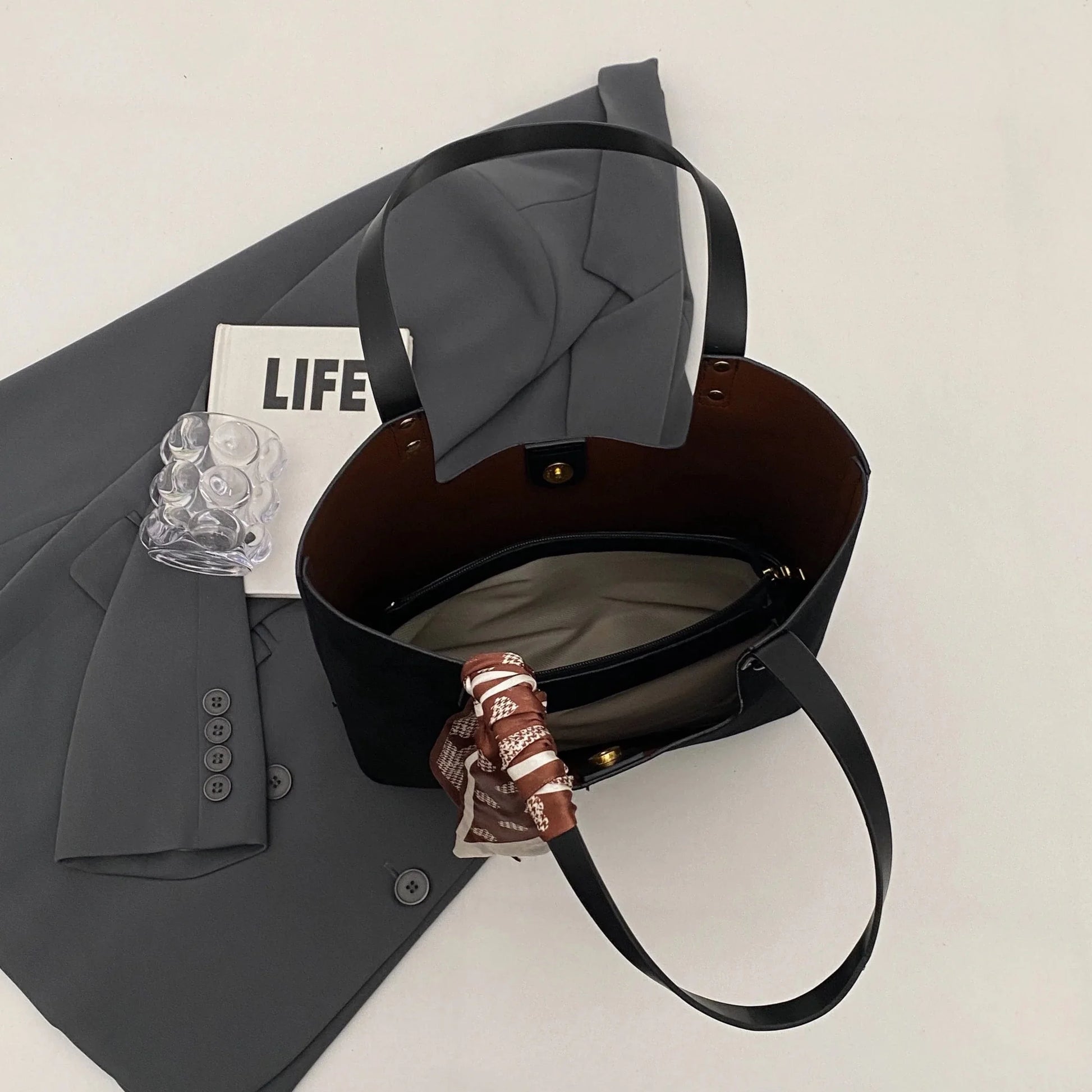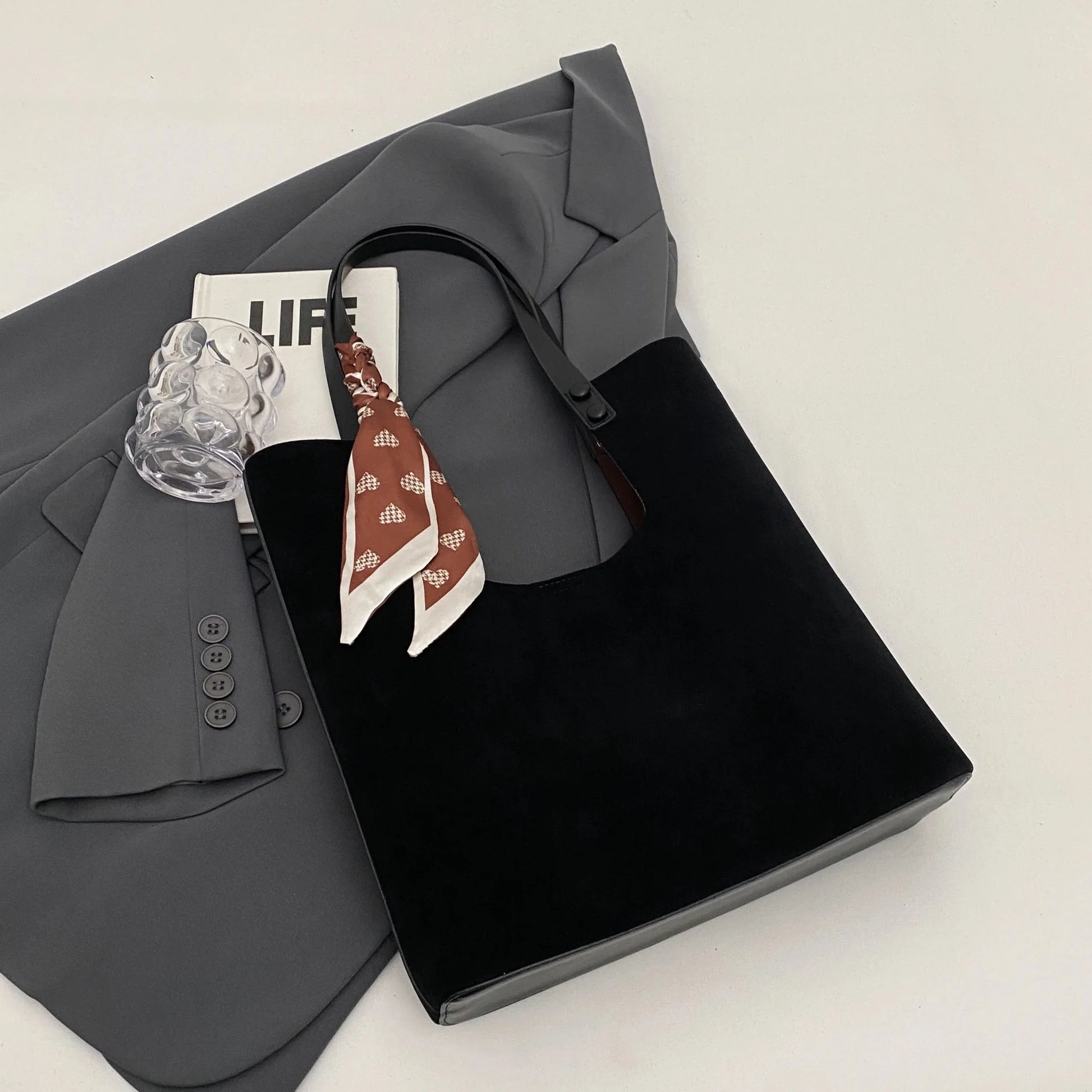 The Genna Elegant Scarf Faux Suede Tote is the perfect combination of style and convenience. Its elegant scarf detailing and unique square cut design adds a touch of personality and functionality. while the faux suede material offers a luxurious feel. With plenty of room and organizational pockets. this tote is the ultimate must-have for any fashion-forward individual on the go.Â