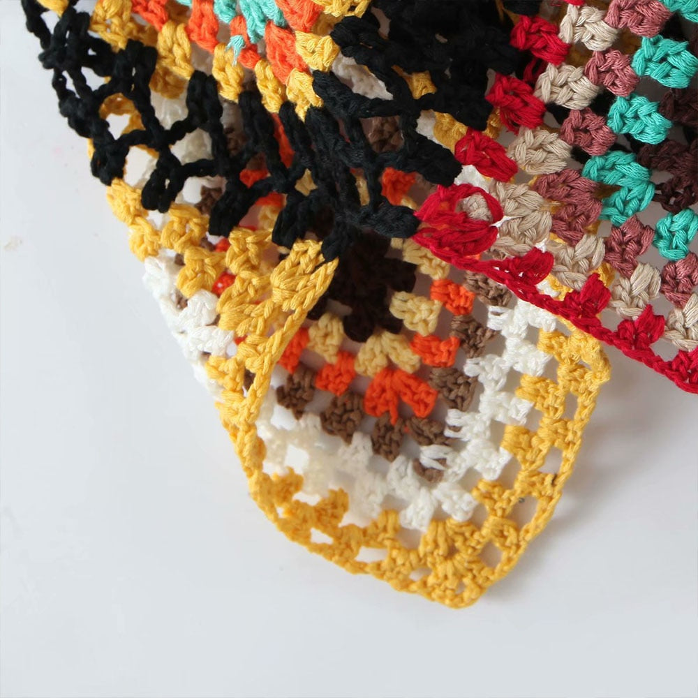 Iliana Multi-Color Patchwork Crochet Dress - 2 Colors. Stylish spaghetti strap bohemian crochet dress. Popular multi-color diamond square patchworks with sexy open back with cross straps. Great summer dress for hot or beach days or night outs.