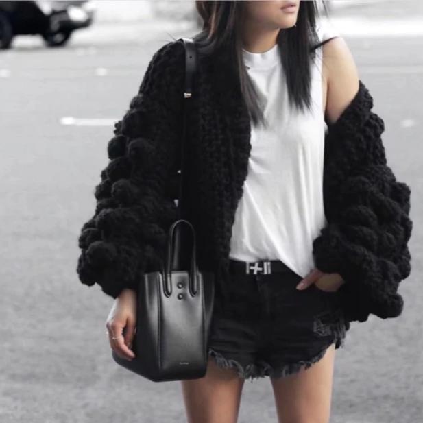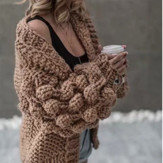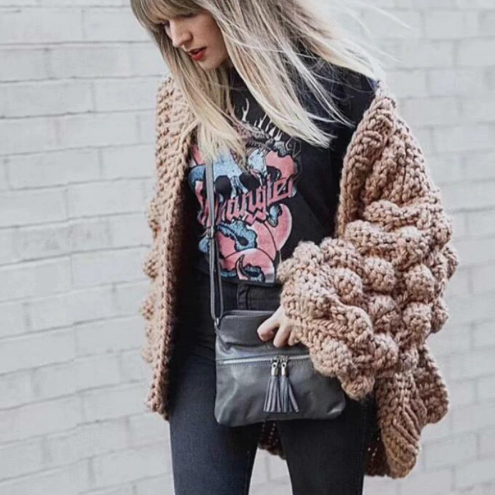 Jennifer Chunky Hand Knit Cardigan Sweater. Really cool and lovely knit sweater. Wear off the shoulder. Oversized bell sleeves are fun and trendy. Hand Knitted. It's the perfect way to stay cozy yet super chic. Find your new winter wardrobe staple - you'll be ready for anything from coffee with friends to a night out on the town.