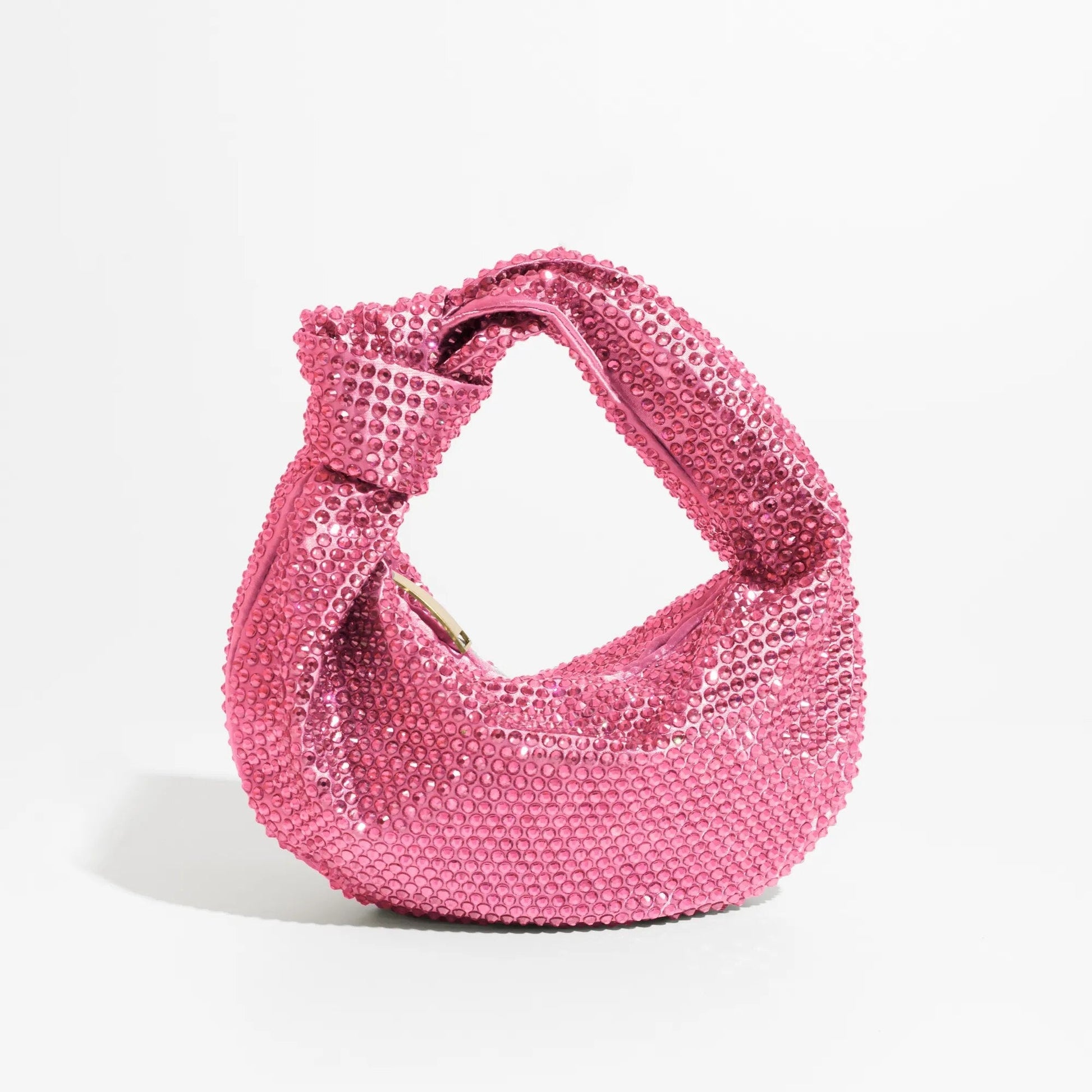 Make a stunning entrance with this Julia Knotted Rhinestone Sequin Wrist Evening Bag! This eye-catching accessory is crafted with intricate details. shimmering sequins. and sparkling rhinestones. Perfect for special occasions. this is the party bag that will have 'em knotting for more!