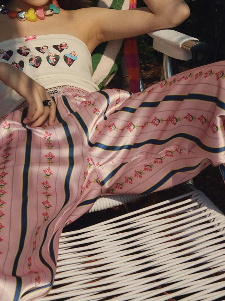 Lounge around all day in the Kaira Stripe Print Satin Pajama Look Pants! These stylish pants look like PJs but with an added touch of sophistication. Crafted from soft satin material. these comfy 'jammies' can take your look up a notch without putting in extra effort. So why not perk up your wardrobe with a pair of these over-the-top pants? (Warning: You may never want to take them off!)