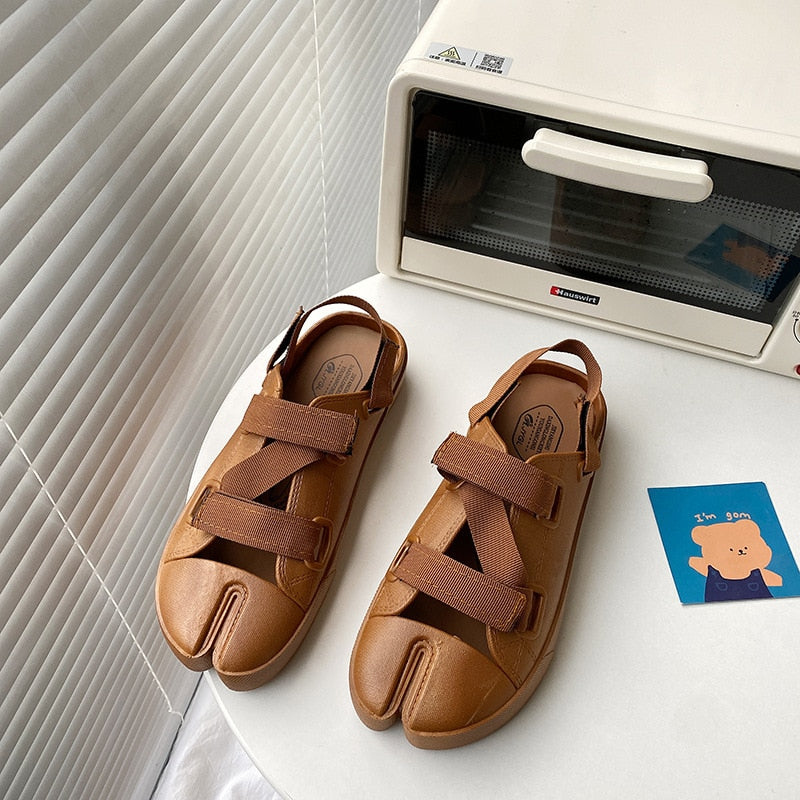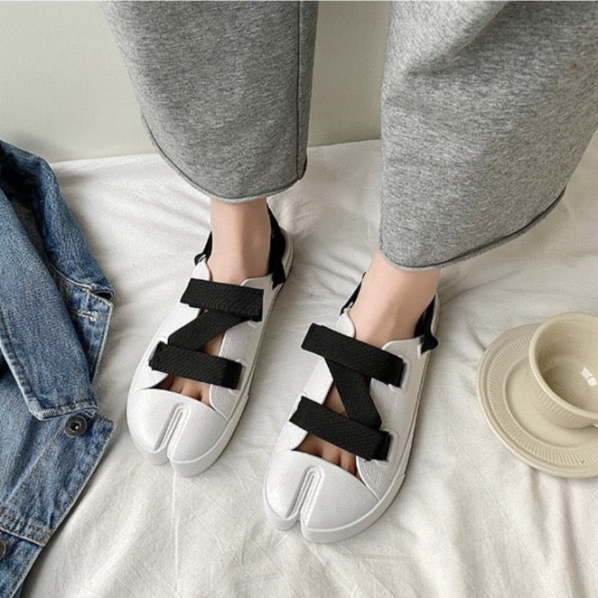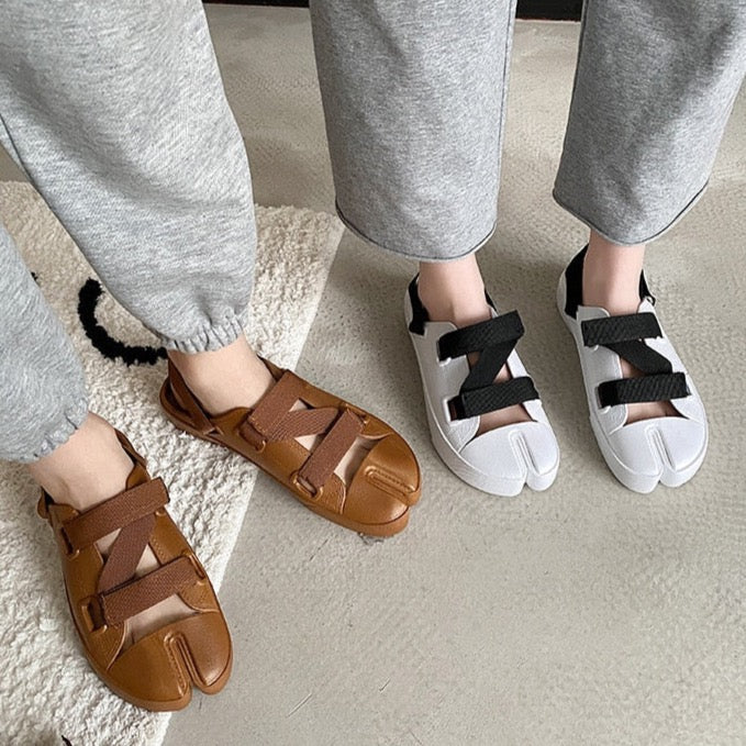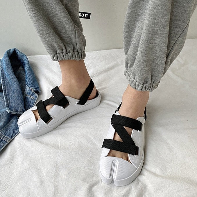 Kanna Split Toe Minimalist Sling Back Sandals - 3 Colors. You could call this minimalist or utilitatian. Popular split toe look with elastic lace-up top and sling back closure. Great item for sporty chic or comfort chic.