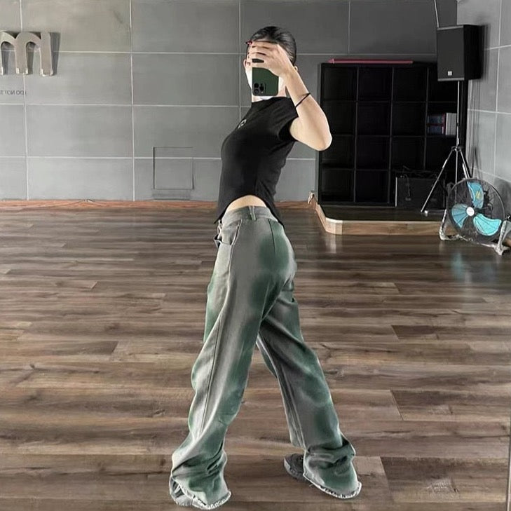 Karim Harajuku Grunge Denim Pants. Super hip tie-dye distressed look denim pants. Perfect grunge style loose pants with a plenty of hip-hop pants silhouette. Frayed hems.Â