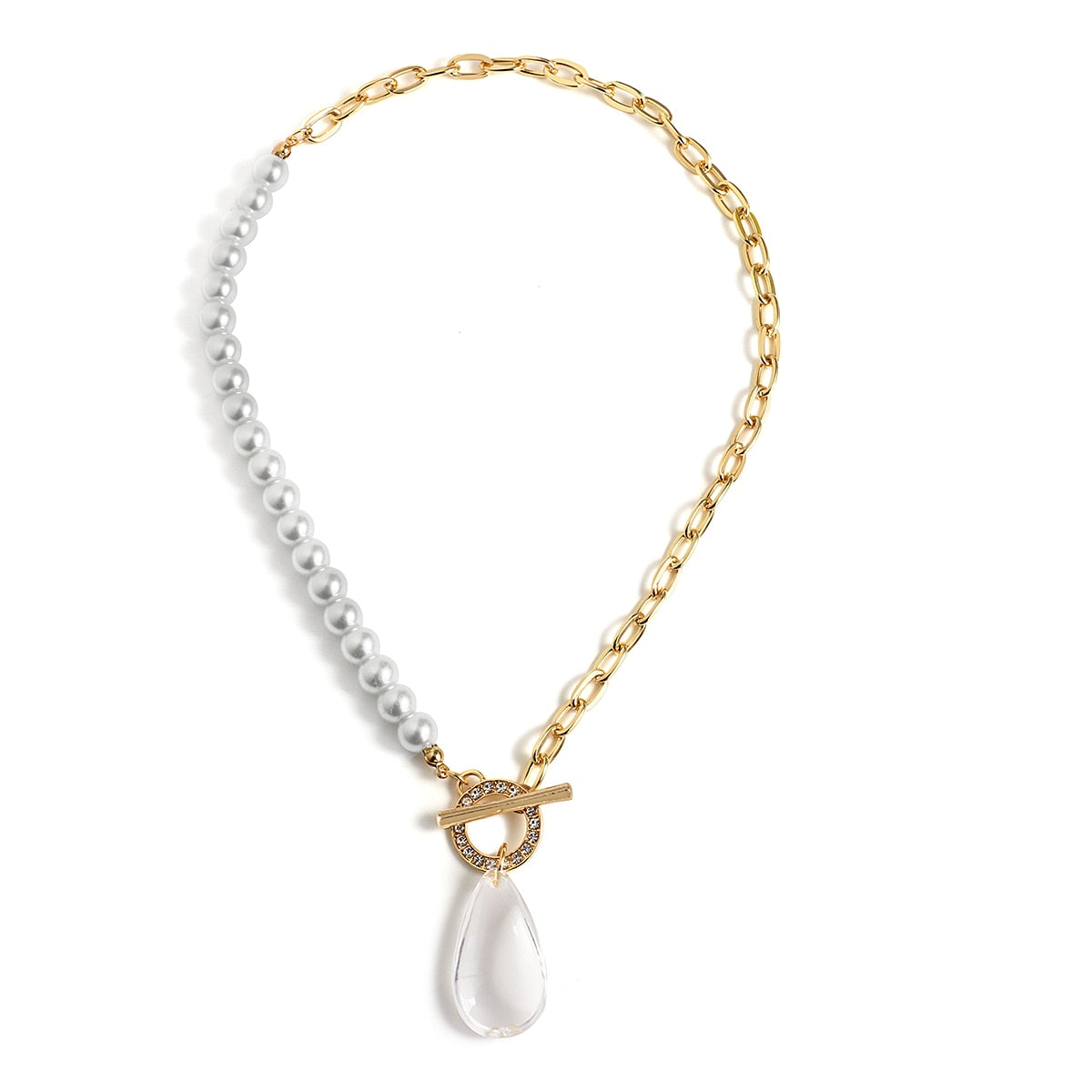 Karin Crystal Water Drop Pendant Necklace. Lovely large water drop crystal pendant necklace with trendy metal chain or mix with pearl links. Bar link closure. Great everyday necklace with trendy elements in the mix. You will gather complement for sure. Love them!