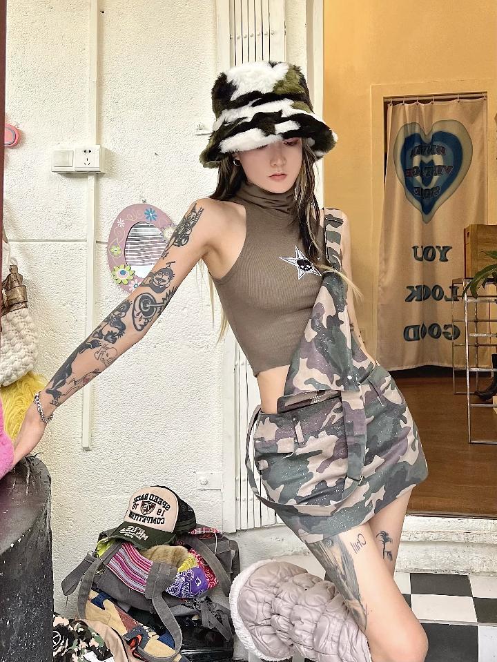 Kasey Harajuku Turtleneck Cropped Top - 2 Colors. Cuter than life adorable ribbed turtleneck sleeveless top with grunge star and skull embroidery. Flattering fit at cropped length. Just get it already.