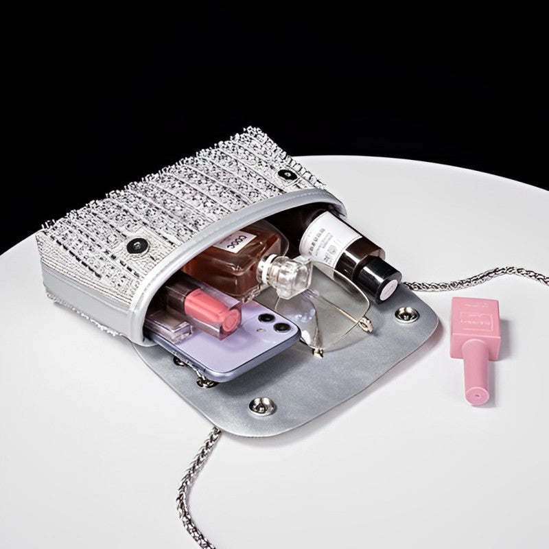 The Kristi Diamond Chain Crossbody Bag boasts intricate rhinestone details that demand attention and admiration. Meticulously placed with precision. these rhinestones create an enchanting mosaic that catches the light and casts a spell of elegance wherever you go. This bag also features a sleek chain strap for more comfort. With ample space to fit all your essentials. it's the perfect companion for every occasion. Now available in silver and colorful.Â