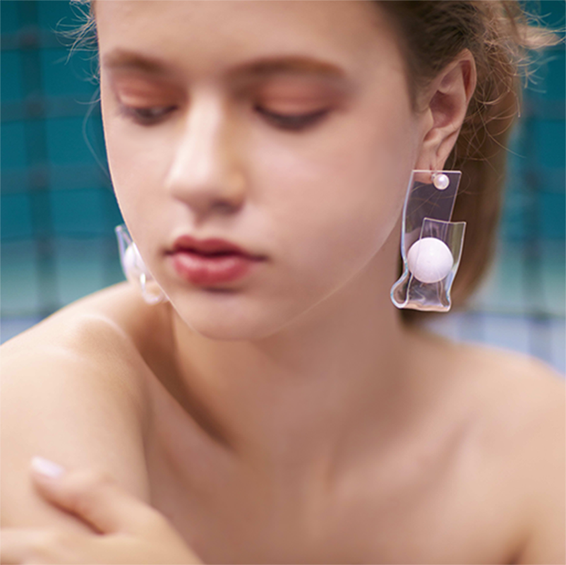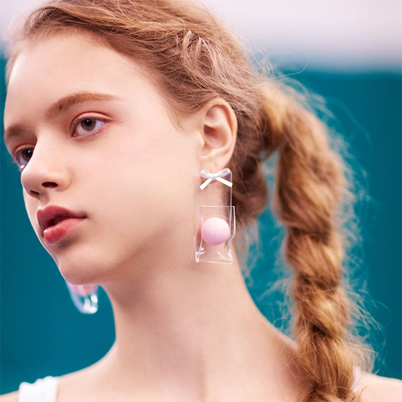 Lexi Clear Panel and Ball Abstract Stud Earrings - 2 Styles. No way to really describe these earrings. Clearly artistic and futuristic look. Twisted clear plastic panel contained lovely pastel color balls and pearl stud / ribbon push back.Â