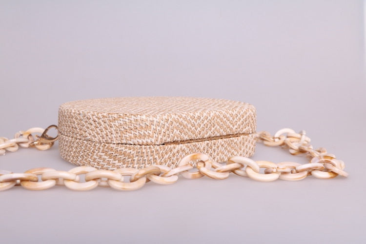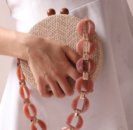 Lorie Round Mini Bag With Resin Straps - 3 Styles. Popular round fabric coin bag with with beautiful beads and resin shoulder strap. Comes with default chain shoulder strap.Â