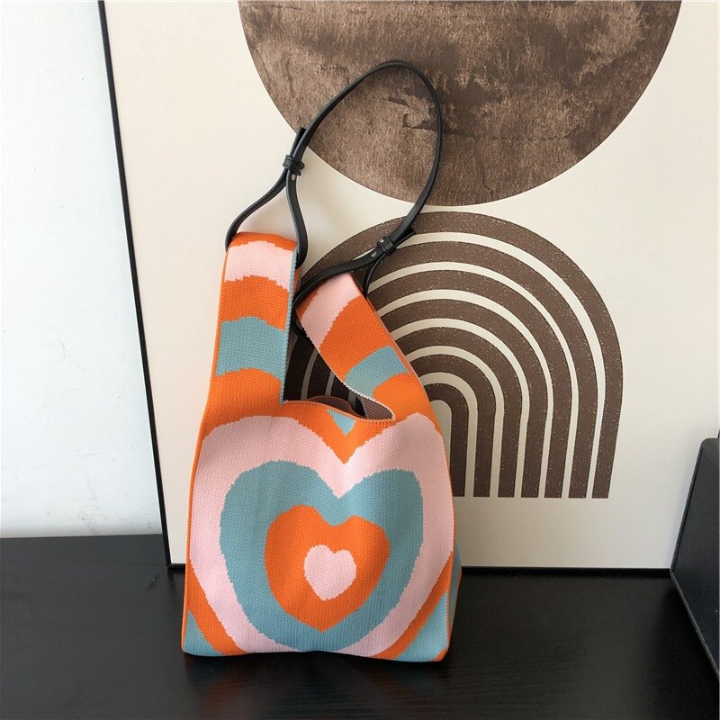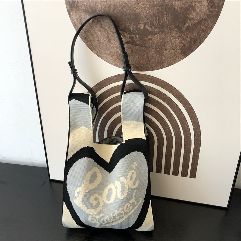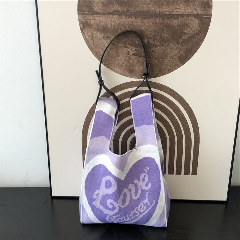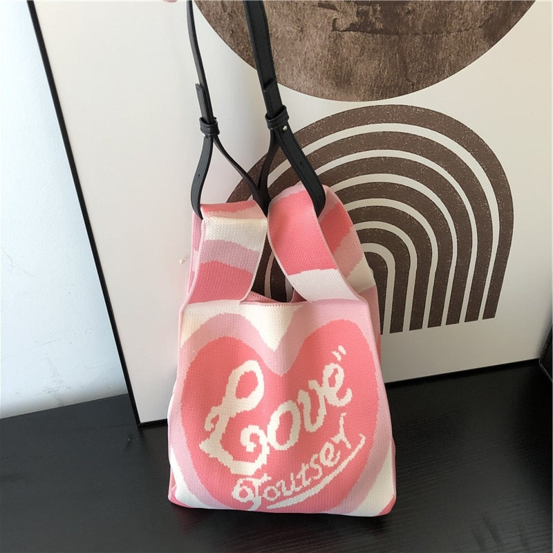 Love and Heart Knit Bags with Shoulder Strap Sets: a most adorbable mash-up of romance(?) and practicality! Popular reusable knot bag in knit fabric with removable shoulder strap options for both knotted handle or shoulder style. Padded pink strap with bag charm for comfort and fun. or add faux leather strap for everyday look. With big letter and pattern. add a little love and heart to your day!Â
