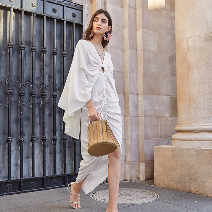 Lucinda Ruched Maxi Dress. Beautifully ruched valance drapery V-neck dress with sexy raised front opening and butterfly sleeves. Sunburst look created by the fabric ruching over the center ring is Goddess beautiful.