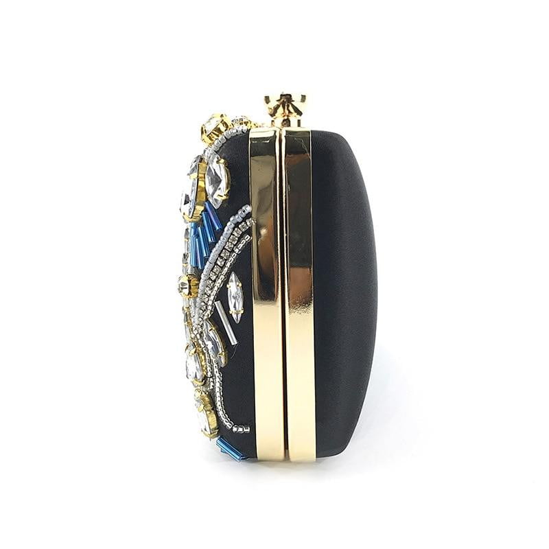 This bag is inlaid with beadings and diamonds. There are 3 colors to choose from black. blue and champagne. Its chain can be disassembled. You can use it as a handbag or a shoulder bag.