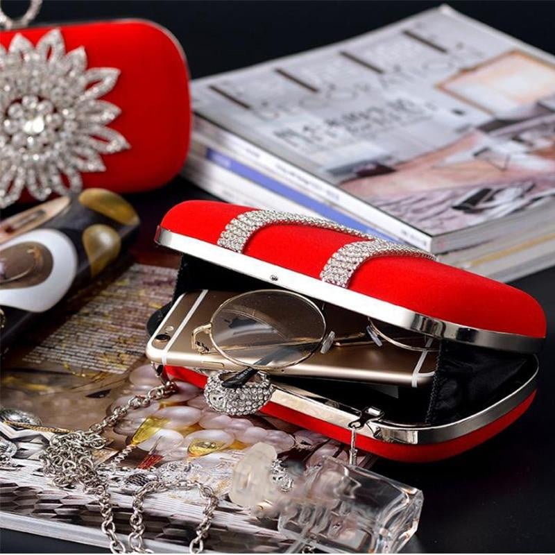 This bag is inlaid with diamonds. These diamonds form the shape of the flower. There are 2 styles (A and B) and 2 colors (red and black) to choose from. The style A is in a shape of flower. The style B is U-shaped.
