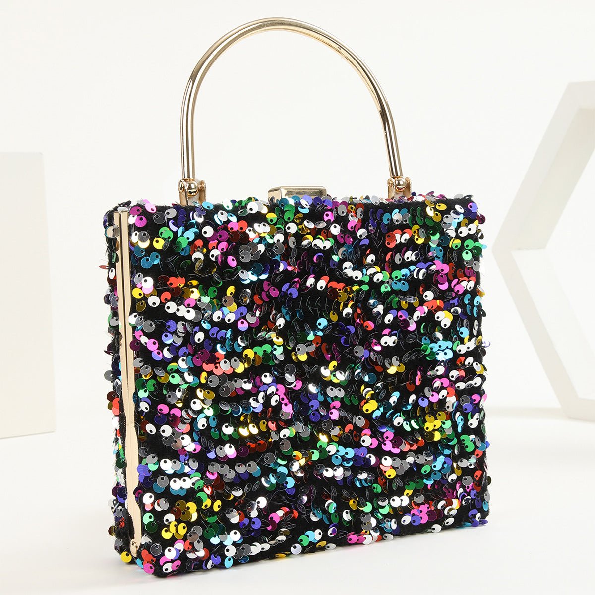The Sequined Evening Clutch is the perfect accessory for any formal event. It features a gold clasp closure and a removable strap. so you can wear it as a clutch or crossbody bag. The interior pocket to store your phone. keys. credit cards. lipstick - anything you need for the evening!