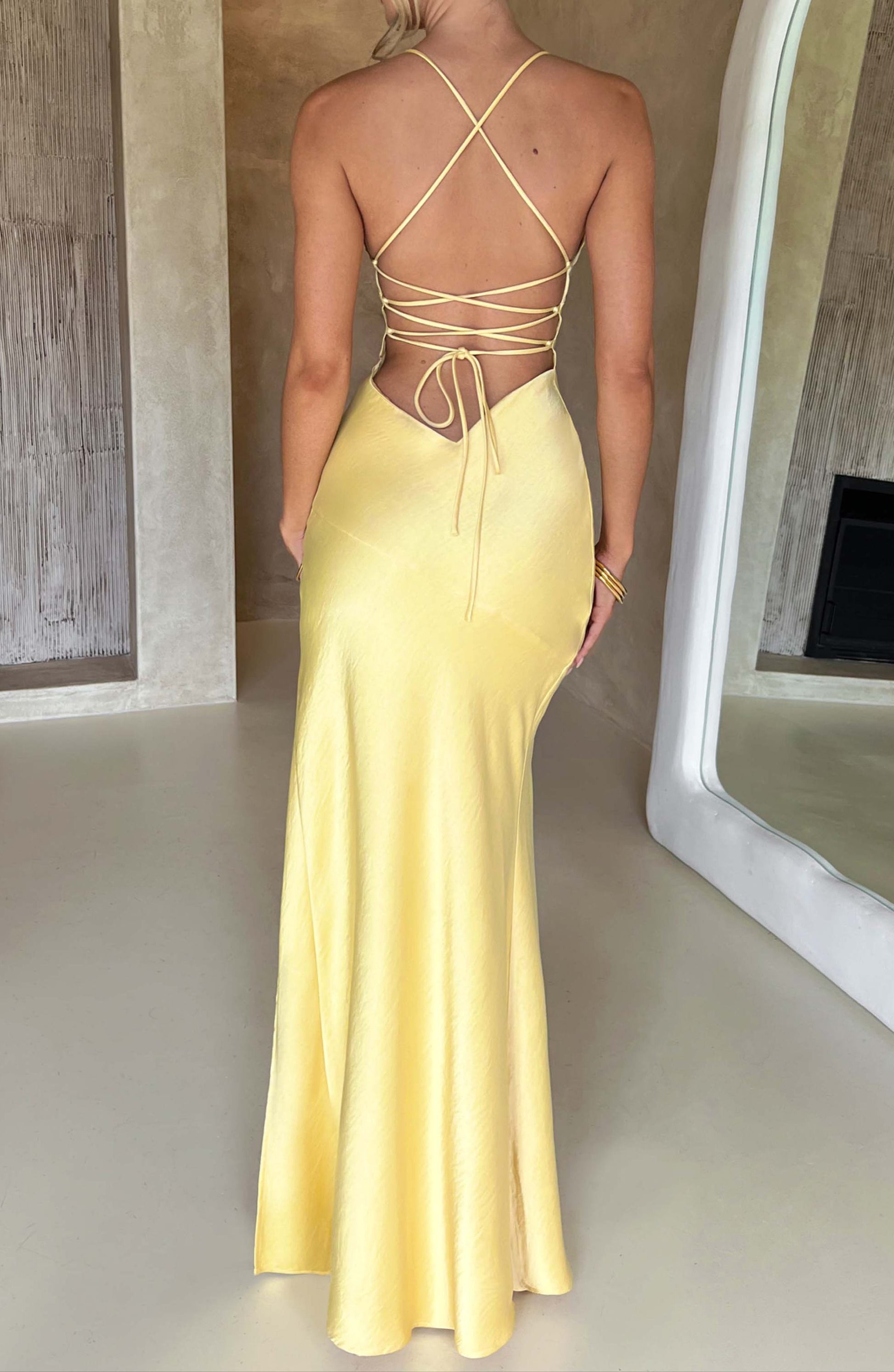 Luxurious Satin Fabric: Crafted from silky. non-stretch bias-cut satin. Isobel offers a luxurious feel and a flawless drape. The lemon color adds a fresh and vibrant touch. making it ideal for spring and summer events.