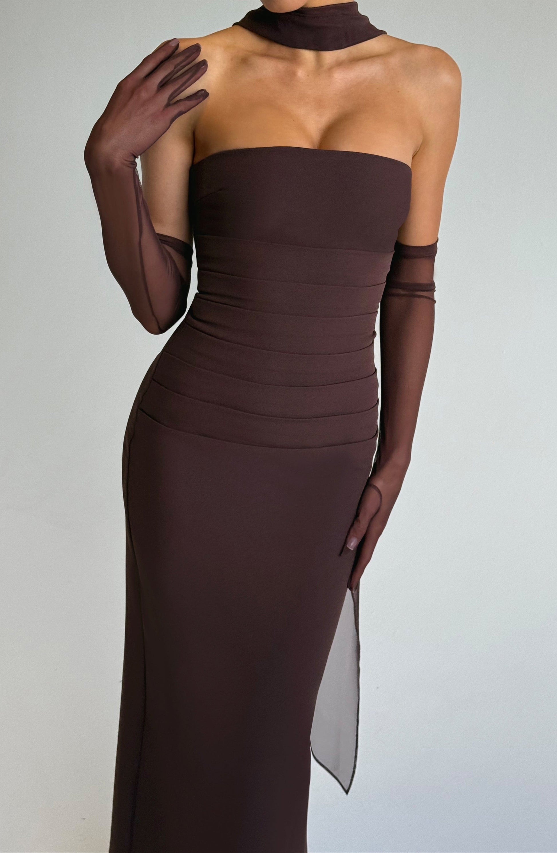 Command attention in this sophisticated plum brown maxi dress. where timeless elegance meets modern versatility. Expertly crafted from sleek non-stretch crepe. this strapless silhouette exudes refined glamour with its structured bodice and graceful column skirt.