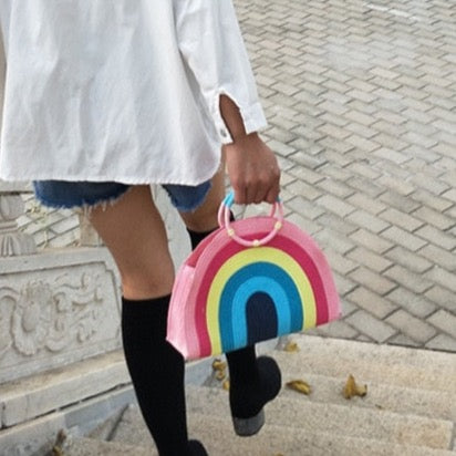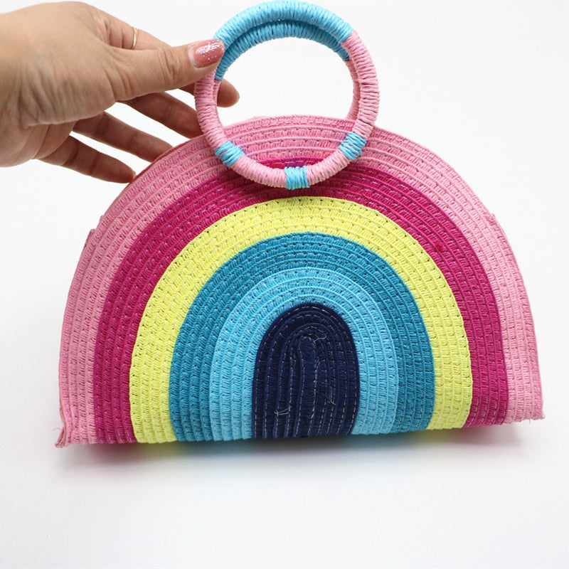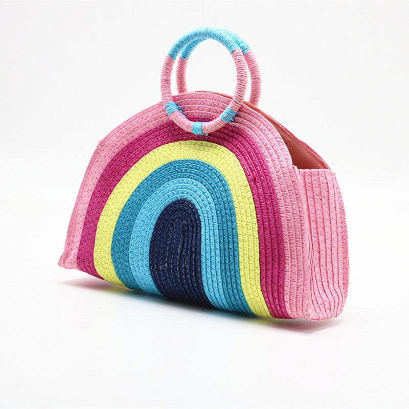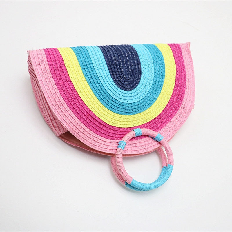 Malia Rainbow Stripe Woven Handbag. Beach day or not. these half moon shape rainbow woven bag with ring handle is just fun and adorable. Full of rainbow hope. this bag works in many styling ways like beach days. bohemian and street style or evern wedding. Style versatility is just limitless. Pair with solid flowy dress or casually with jeans and more!