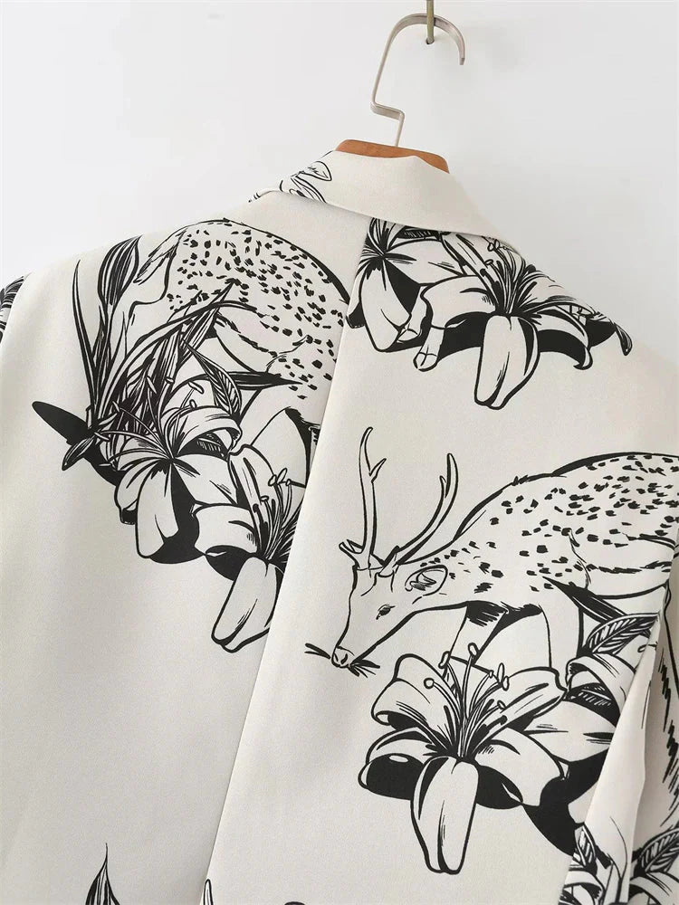 This luxe look Mamiya blazer boasts a vivid floral print of deer and lilies. creating a distinctive. statement-making look that is sure to turn heads. Designed with beautiful detail and quality tailoring. it gives looks of opulence. sophistication and understated elegance. A timeless classic. this blazer is perfect for turning heads on any special occasion.