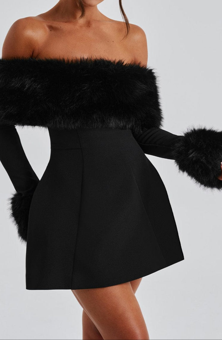 Cosy & Cute for the Season: Meet Villanelle. the ultimate mini dress designed for both comfort and style. Featuring a plush faux fur-trimmed neckline and cuffs. this dress is perfect for staying warm while looking effortlessly chic during the colder months.