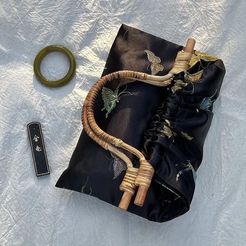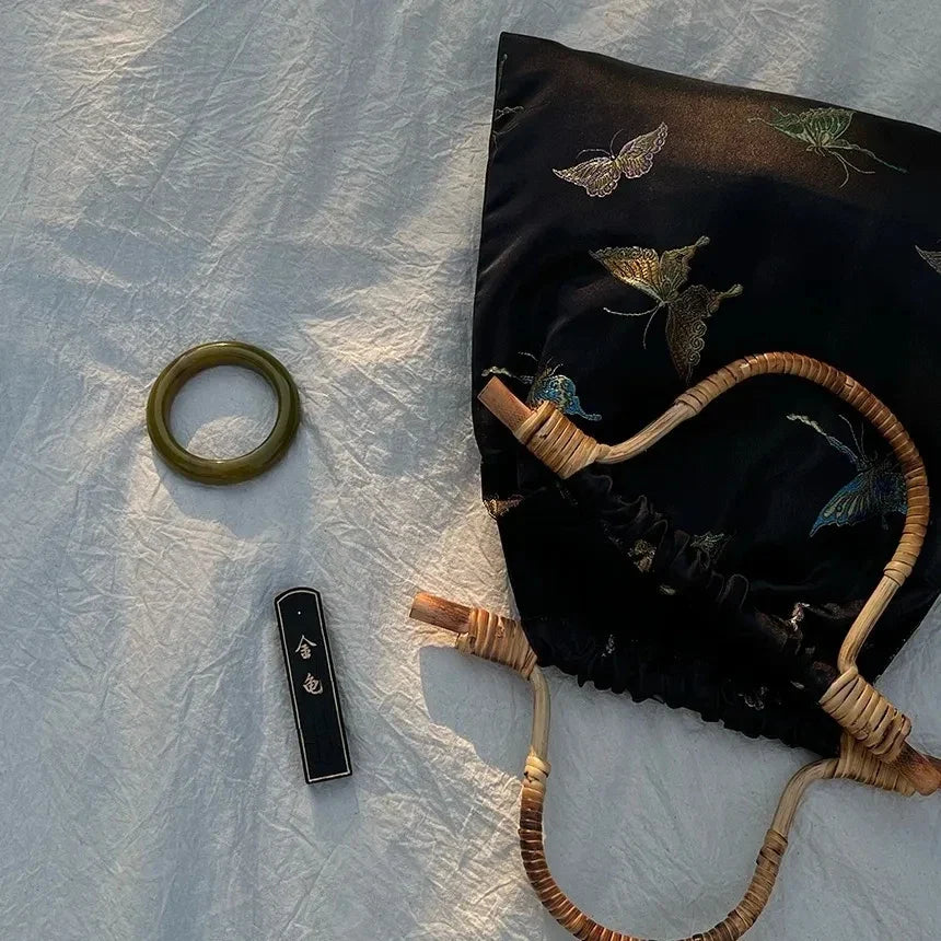 Mira Butterfly Silk Embroidery Bamboo Handle Tote