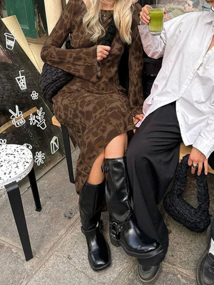 New Street Slim Retro Print High Waist Femme Bodycon Maxi Dress