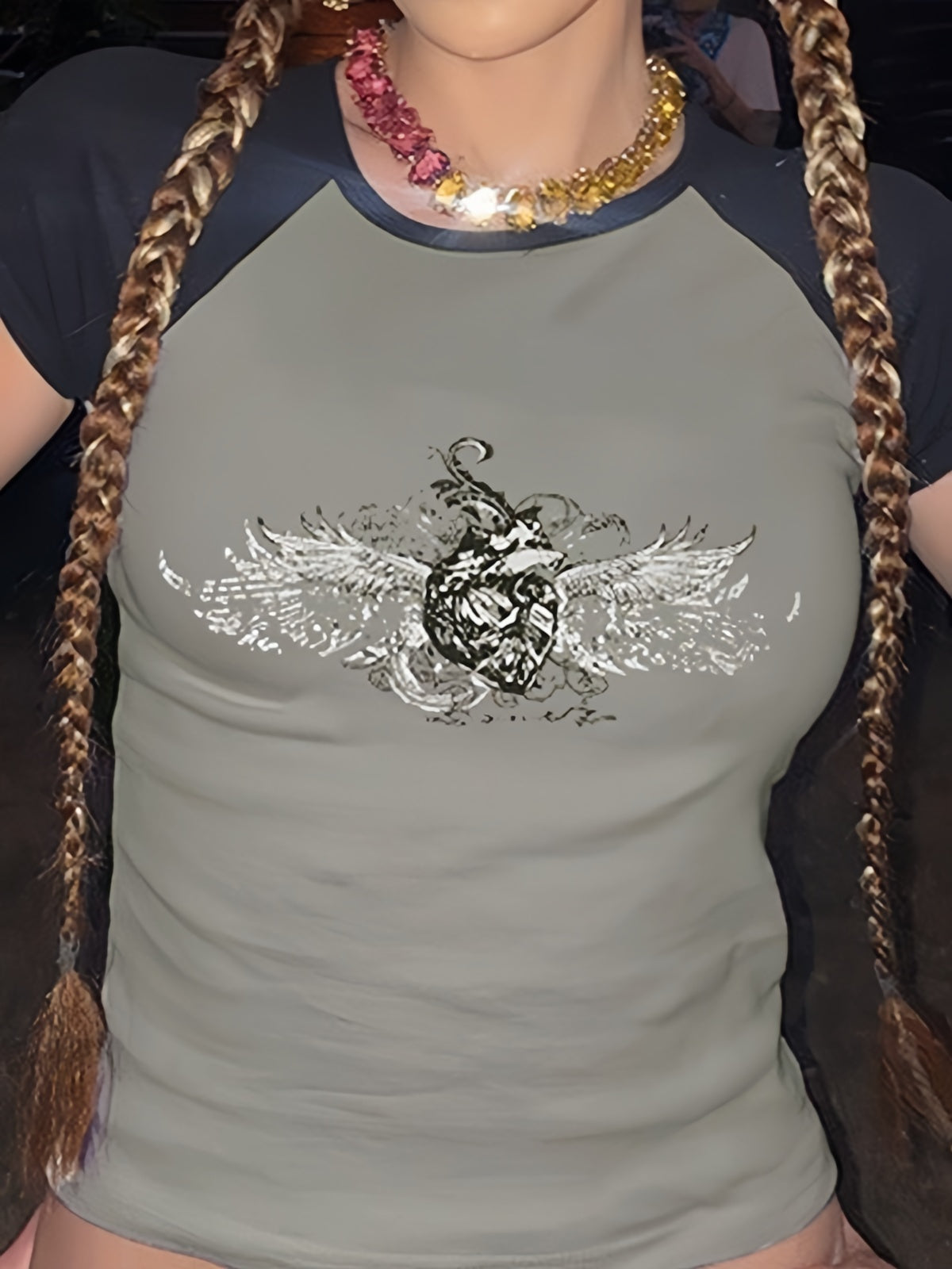 Raglan Sleeve Crop Top with Grunge Wing Print