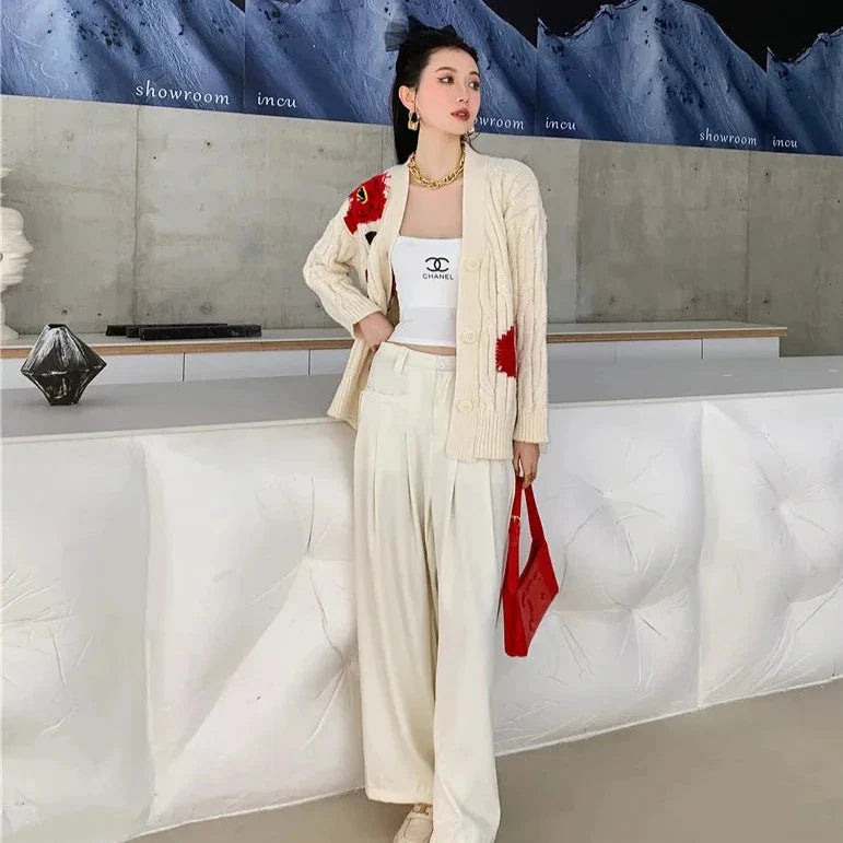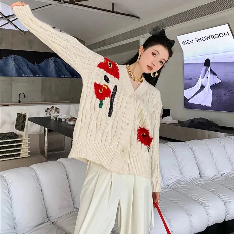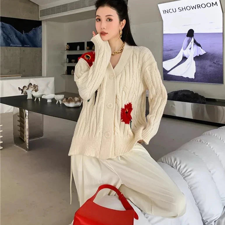 Red Flower Cable Knit Sweater Cardigan