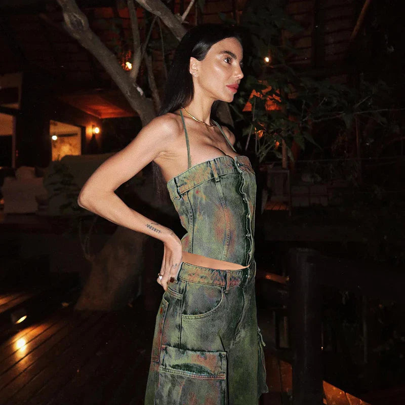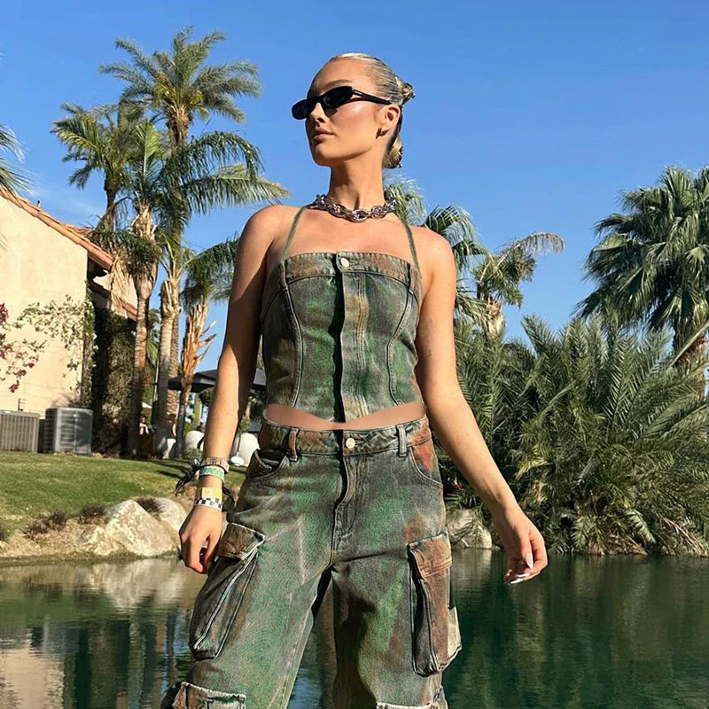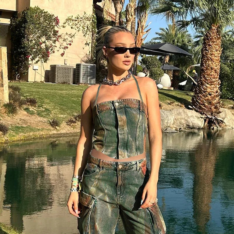 Denim Button Backless Off Shoulder Cami Top