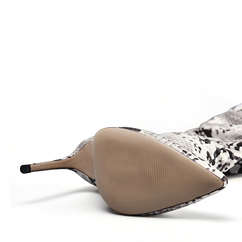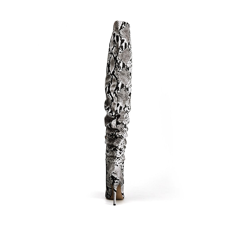 Slouchy Thigh High Snakeskin Print Boots. Super sexy over the knee boots with slouchy feature and trendy white snakeskin prints. Perfect over jeans or with any length of skirts or dresses. these boots look amazingly hot and fashion forward. Faux Leather. Hand made. Ships 3-4 days from ordering.Â