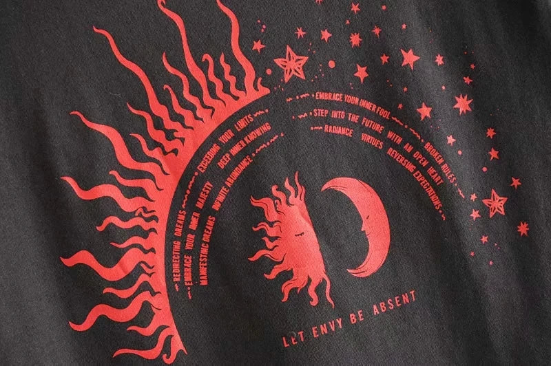 Add some sunshine to your wardrobe with the Soleil Luna Graphic Print Cropped T-Shirt. This playful and quirky top features a unique graphic print and cropped hemline for a fun and stylish look. Perfect for any casual occasion literally for day and night. this t-shirt is sure to make you stand out with its cool graphic print design.Â