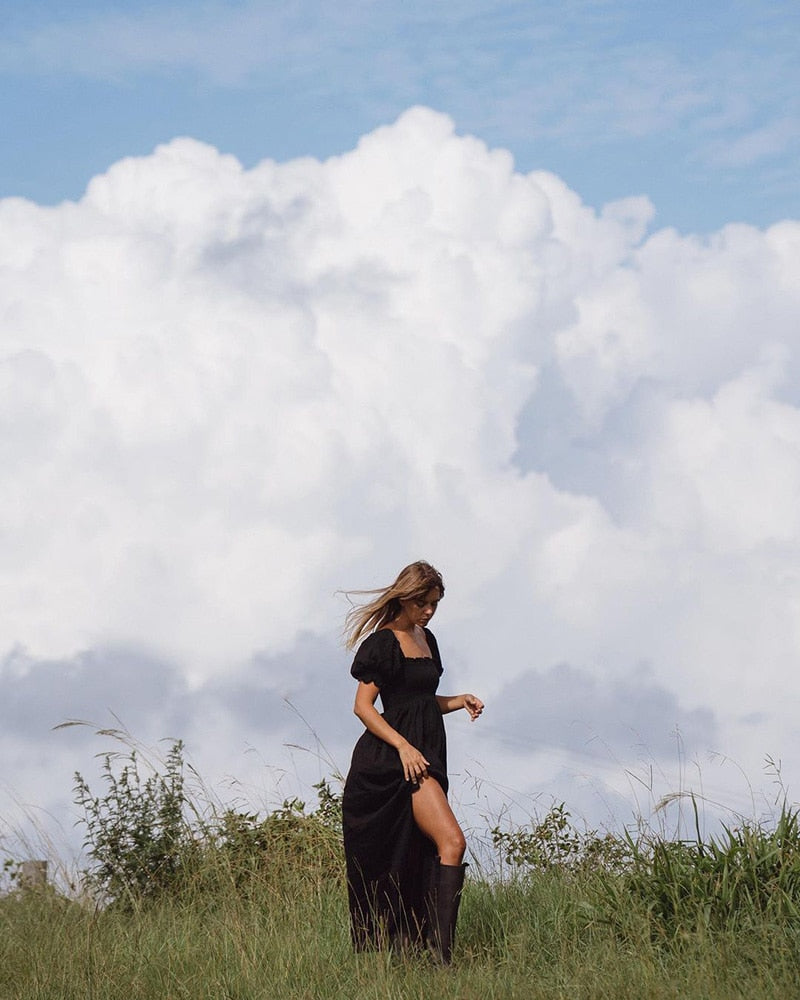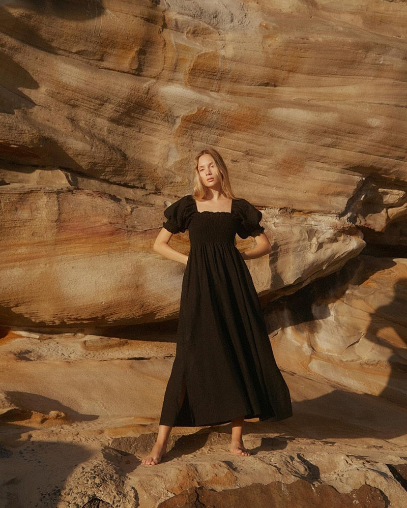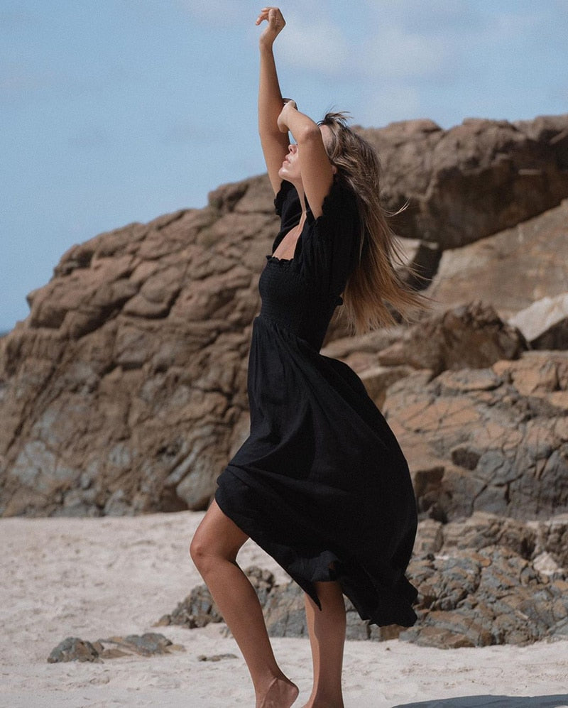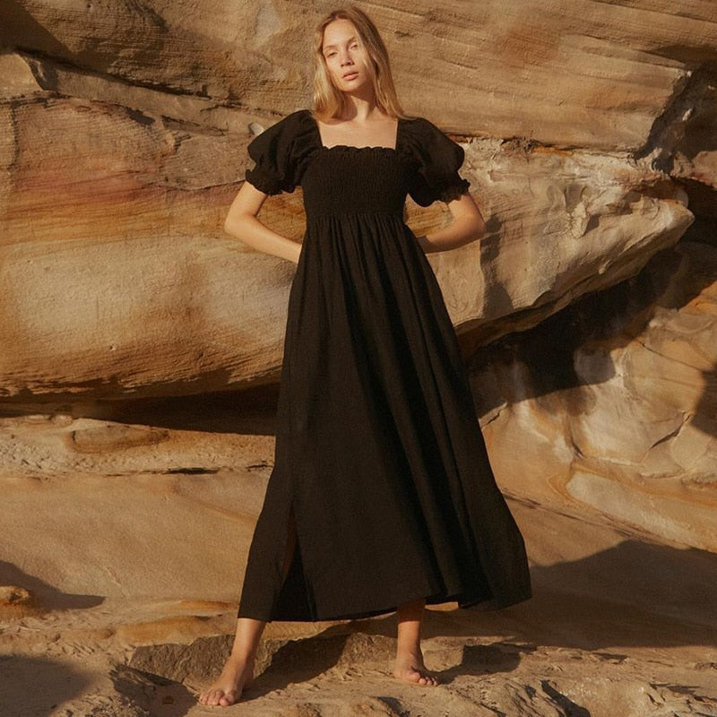 Summer Dresses For Square Neck Smocked Short Puff Sleeve Vacation Beach Style