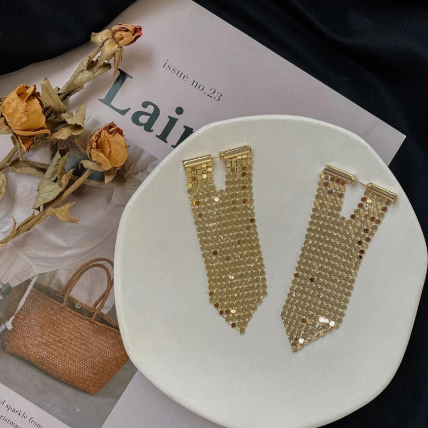 sCatch attention with Tarcy Cascade Chain Mail Tassel Earrings! Stylish and stunning. these earrings are sure to turn heads with their eye-catching linked chainmail and shimmery tassel. Perfect for special occasions or jazzing up an everyday look - take your earring game to the next level!