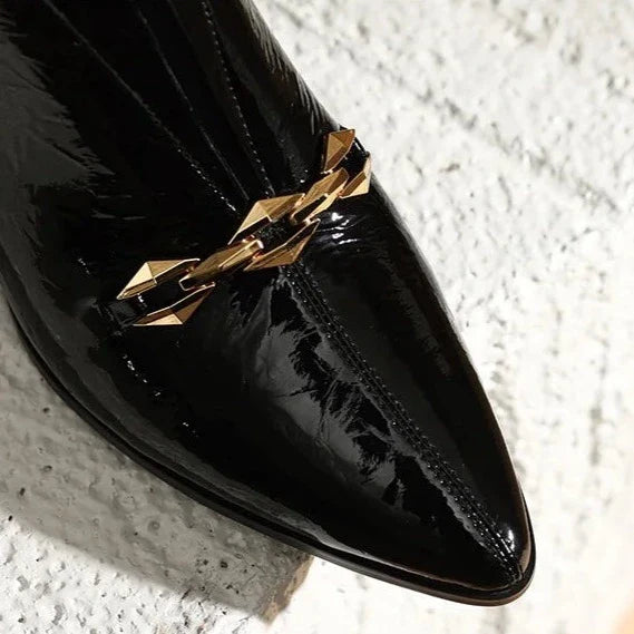 Add a dash of chic charm with the Tempany Elegant Bootie Pumps. These trendy shoes boast a beautiful glossy leather envelope folding design upper. gold metal chain buckle and a sleek geometric cut-out heel. making them one of kind piece to own. Handmade to perfection.