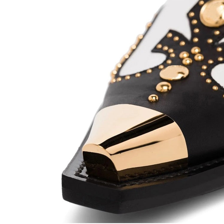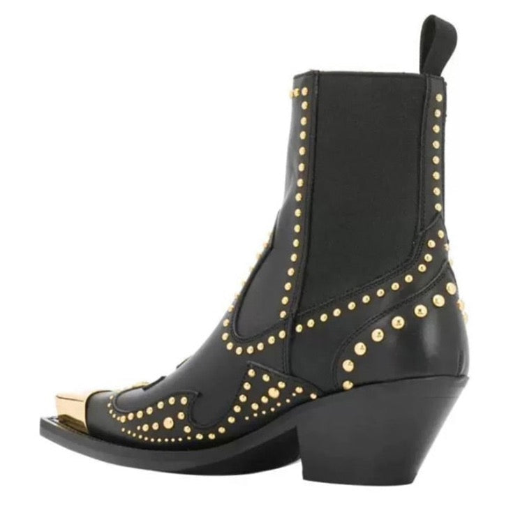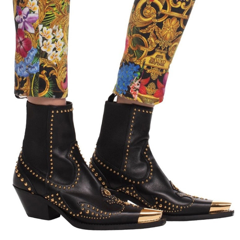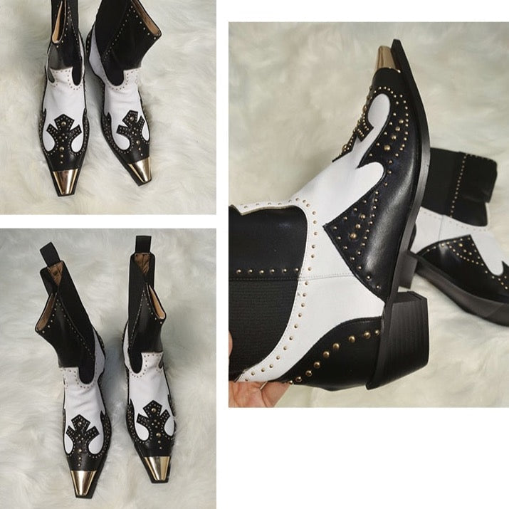 Vahalla Metal Toe Western Chelsea Boots - 3 Styles. Fashionable and stylish western pattern patchwork chelsea boots with metal rivets and toe details. Cowboy boots at ankle length. cool western swirl patterns with cool top stitch embroidery.Â