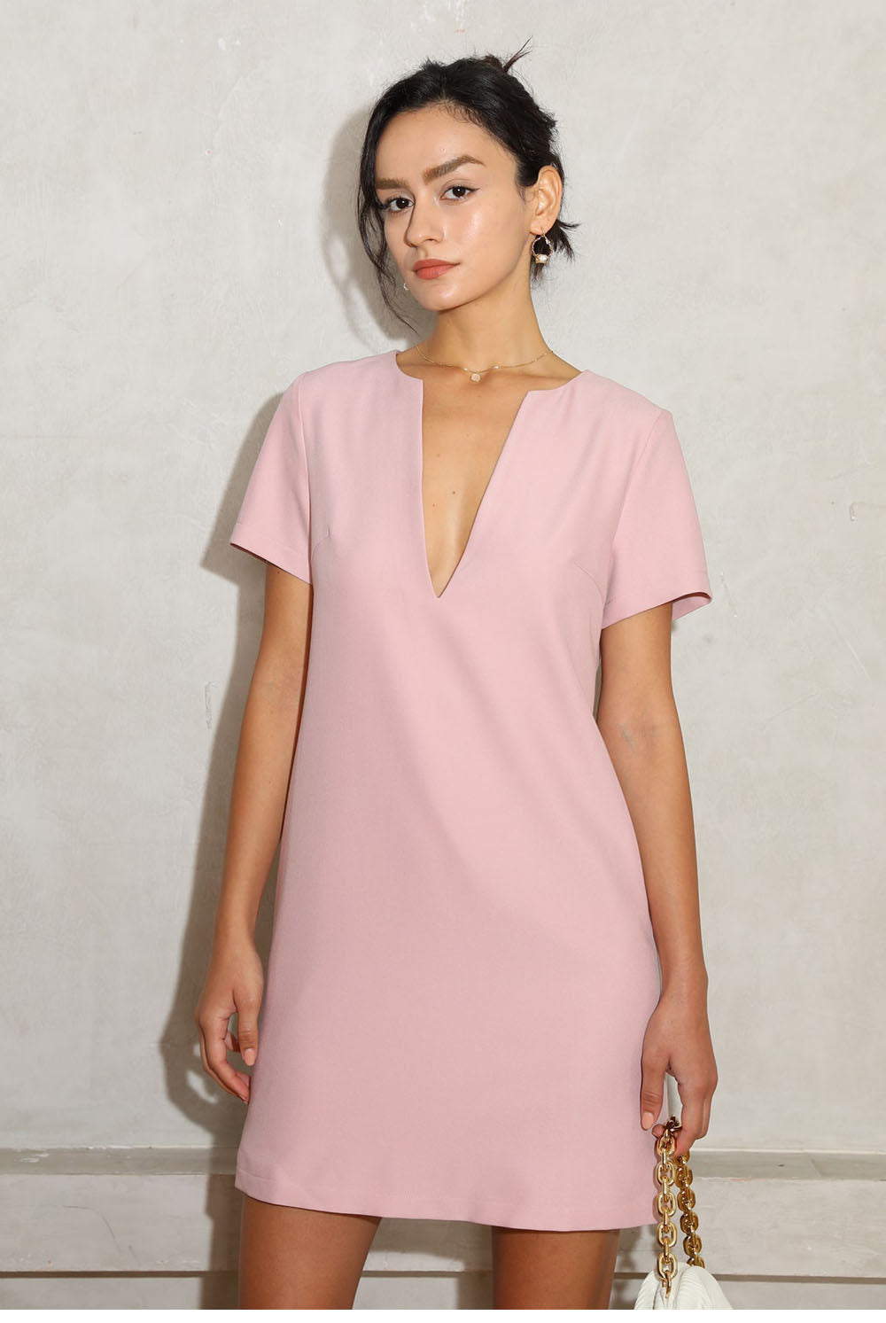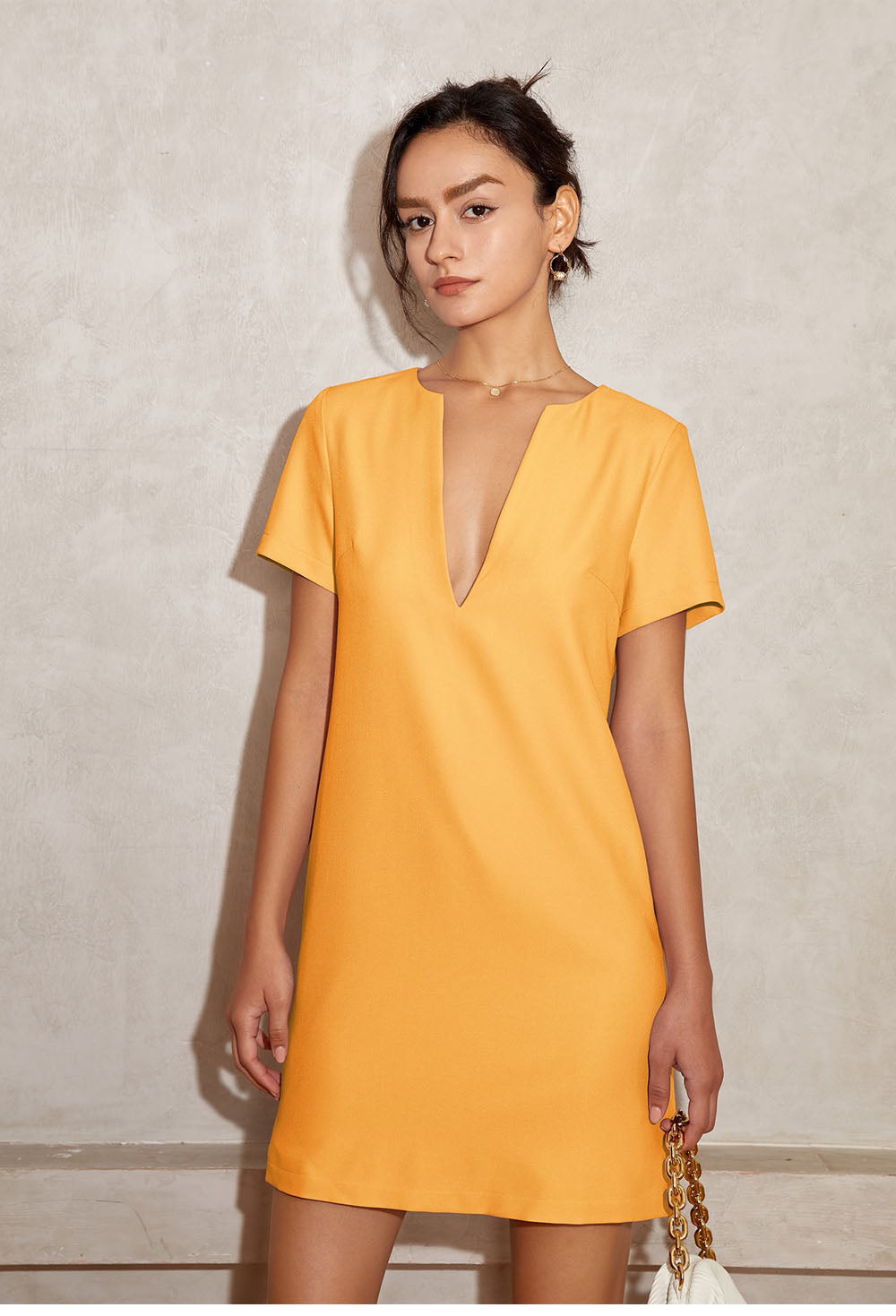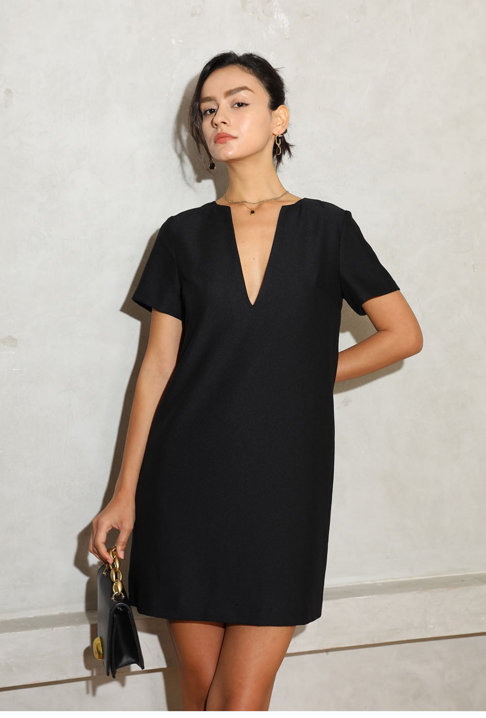 Vanessa V-Neck Solid Tunic Mini Dress - 7 Colors. This simple and clean line solid dress with deep V-neck and a back slit is sexy and it could be all you want ro wear out during the summer or more. Basic mini dress piece like this is unexpectedly stylish and versatile for any occasions.Â