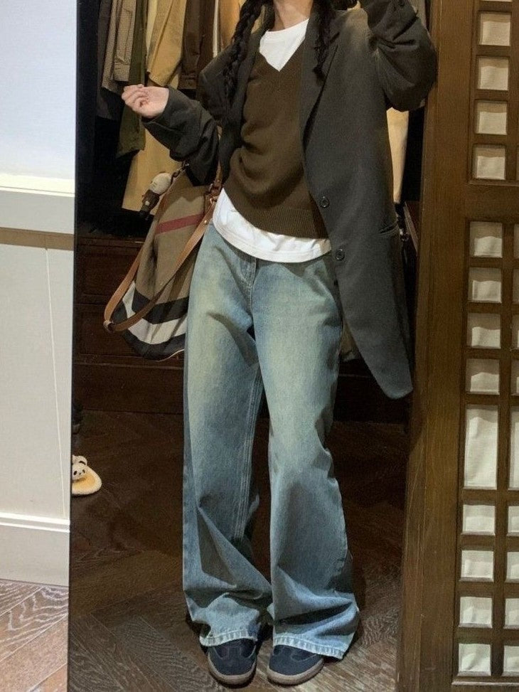 Vintage Washed Effect Wide Leg Jeans