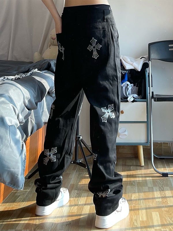 Vintage Loose Fit Jeans with Cross Rhinestone