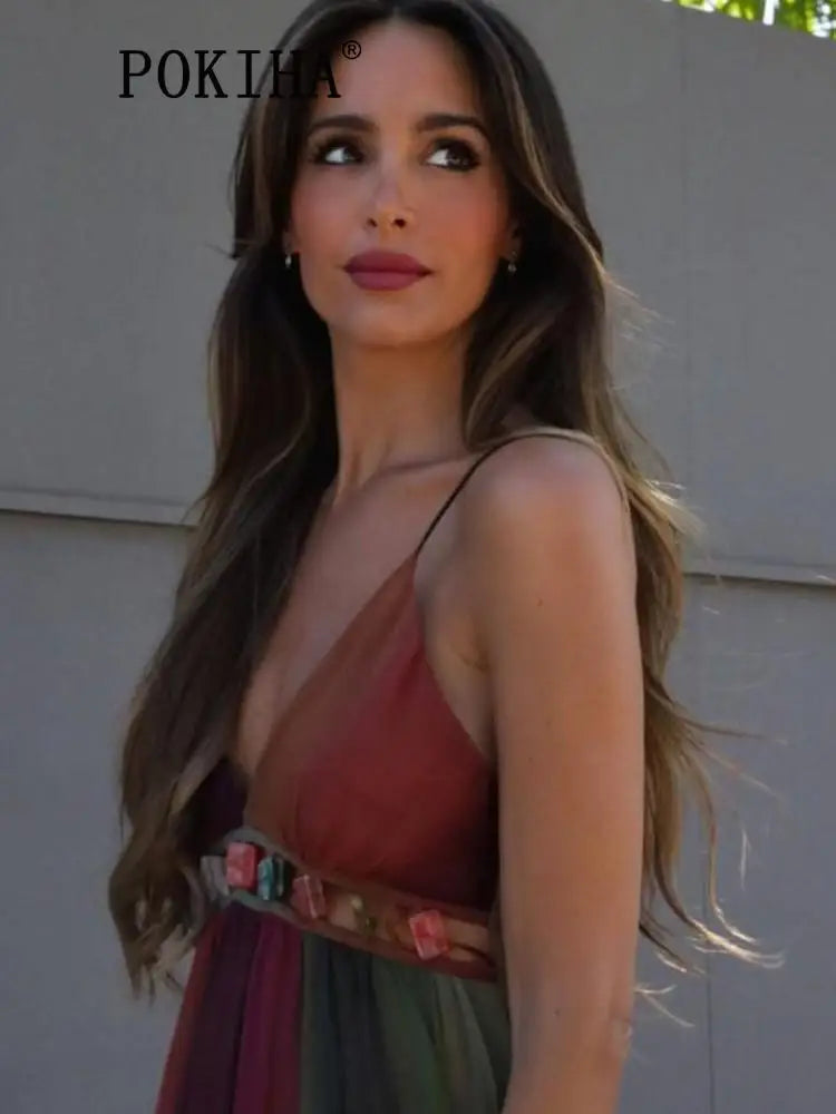 Vintage Sleeveless V Neck High Waist Tie Dye Camo Boho Dress