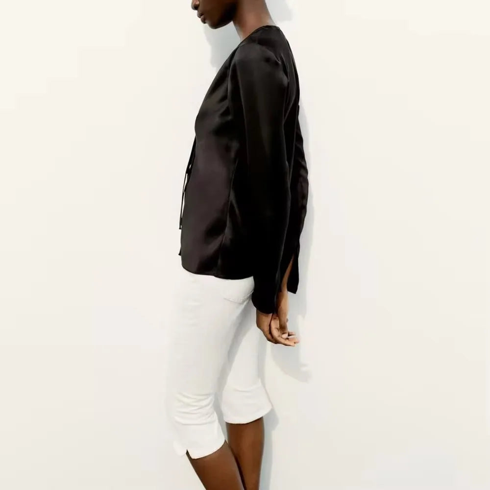 Women's Fashion V-neck Tie Up Bow Silk Satin Blouse