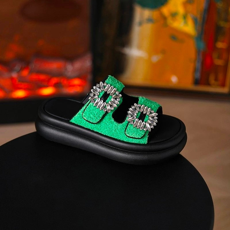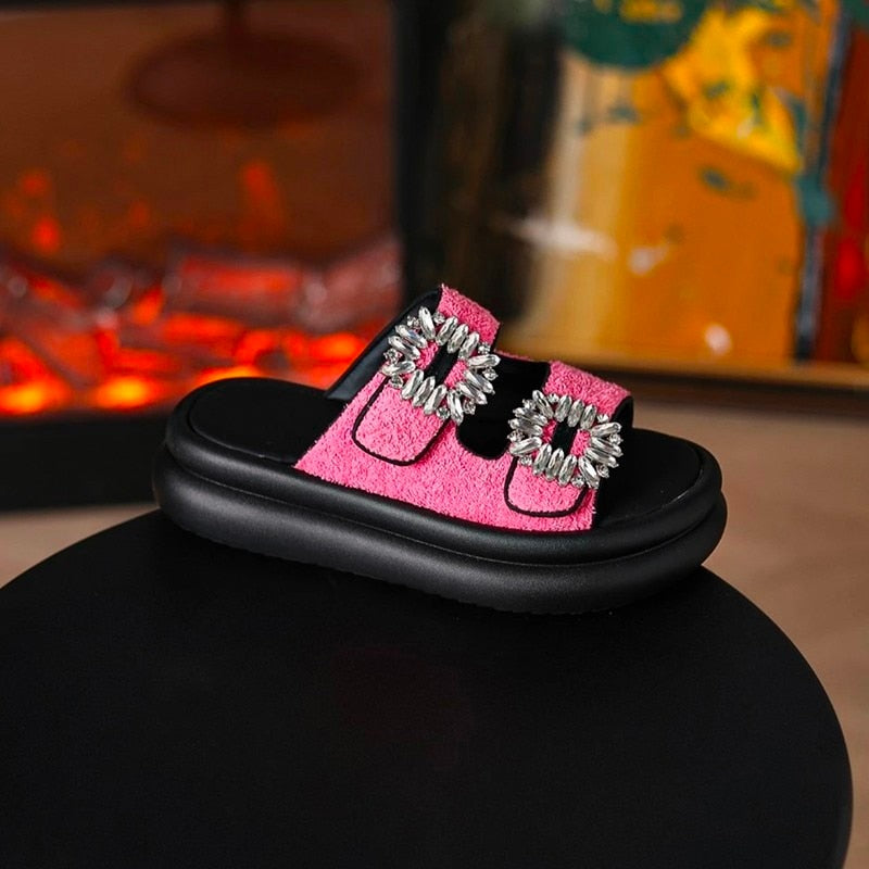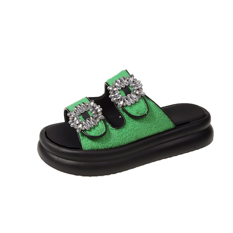 Step in style! Shine on with the Wren Rhinestone Buckle French Terry Sandals! Boast of beautiful rhinestone detailing. a French terry upper and a crystal-clear buckled trendiness. Spectacularly sparkly shoes with serious swagger!