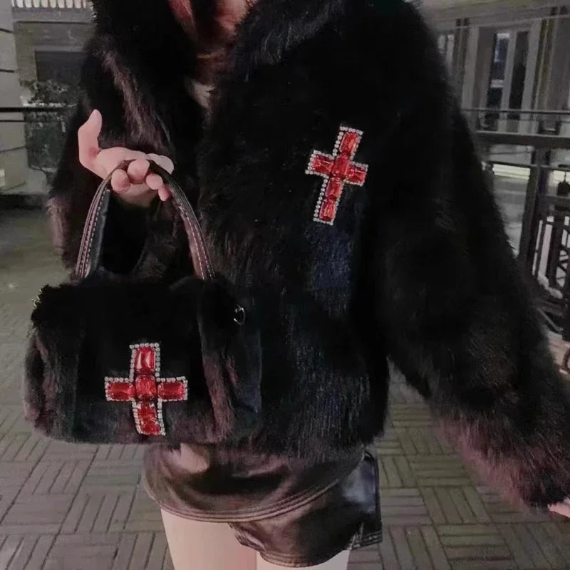 Y2K Gothic Soft Plush Black Cross Applique Harajuku Punk Hip Hop Shoulder Bag