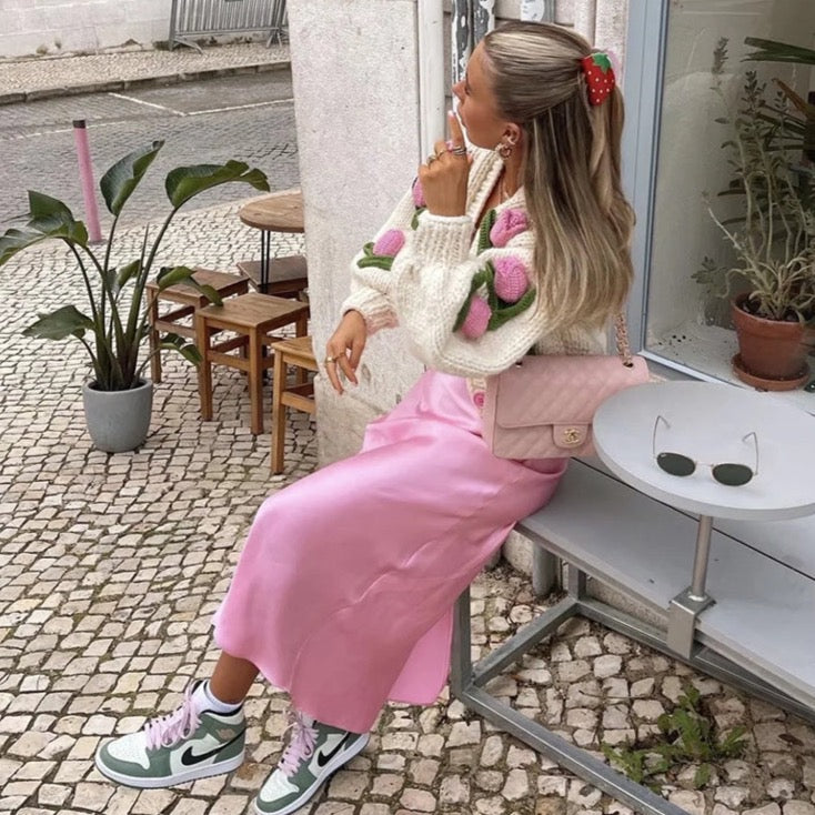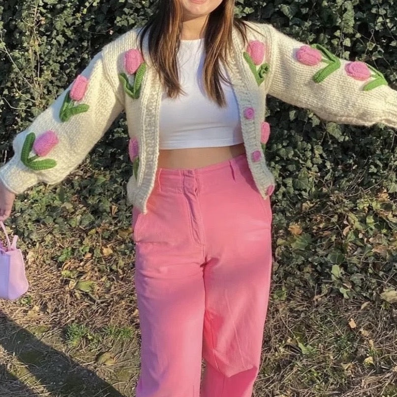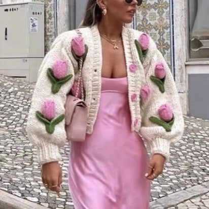 Yanna Chunky Knit Tulip Cardigans - 2 Colors. Popular oversized look chunky knit cardigan with puff sleeve and retro tulip flower appliques. Adorable for casual lounging. cover up for chilly nights and styling to sweeten up your outfit. Chic!