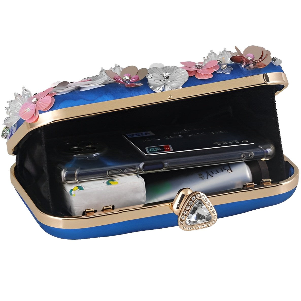 This feminine and beautiful bag is designed for a woman who wants to make a statement. This handcrafted clutch features a beautiful assortment of beads and flowers that give off a soft and subtle feel. It is sure to become a staple in your wardrobe. Now available in blue. black. and gold.