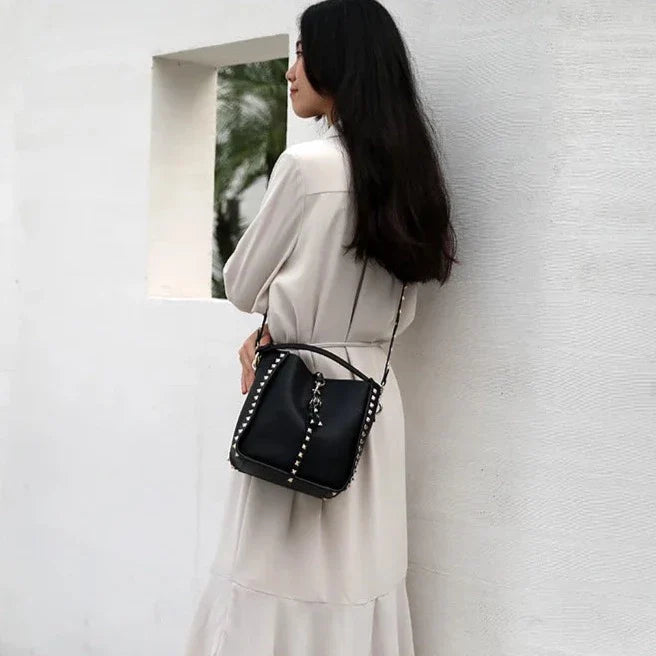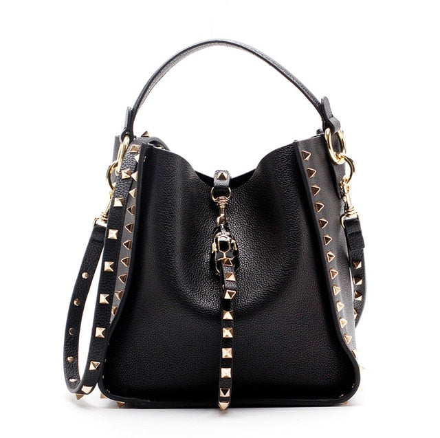 Luxe Riveted Leopard Head Lock Leather Bucket Bag - 7 Colors. Really cool and edgy color block bucket bag with enamel leopard head swivel lock and rivet details. Classic rich colored and made with genuine leather. this bucket bag is highly stylish and has that luxe look. 7 Amazing colors in 2 Sizes.Â